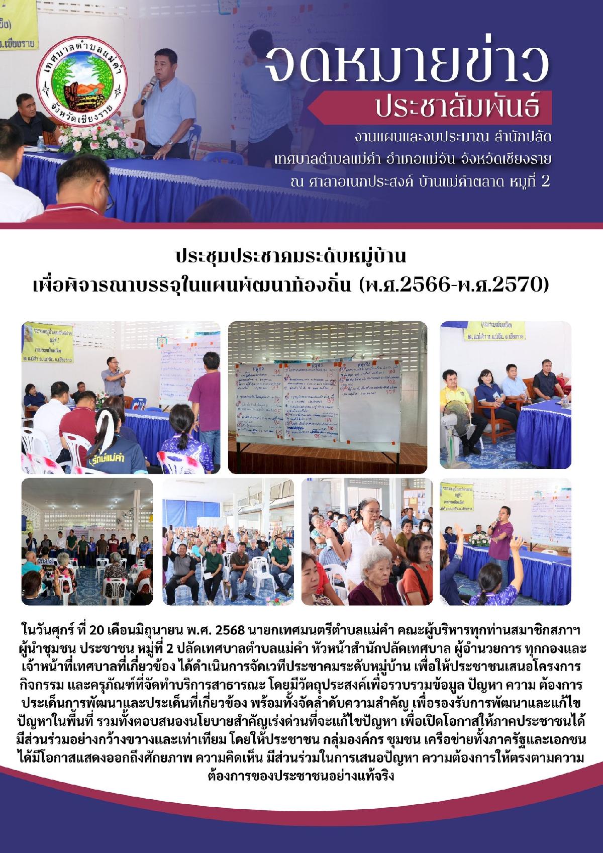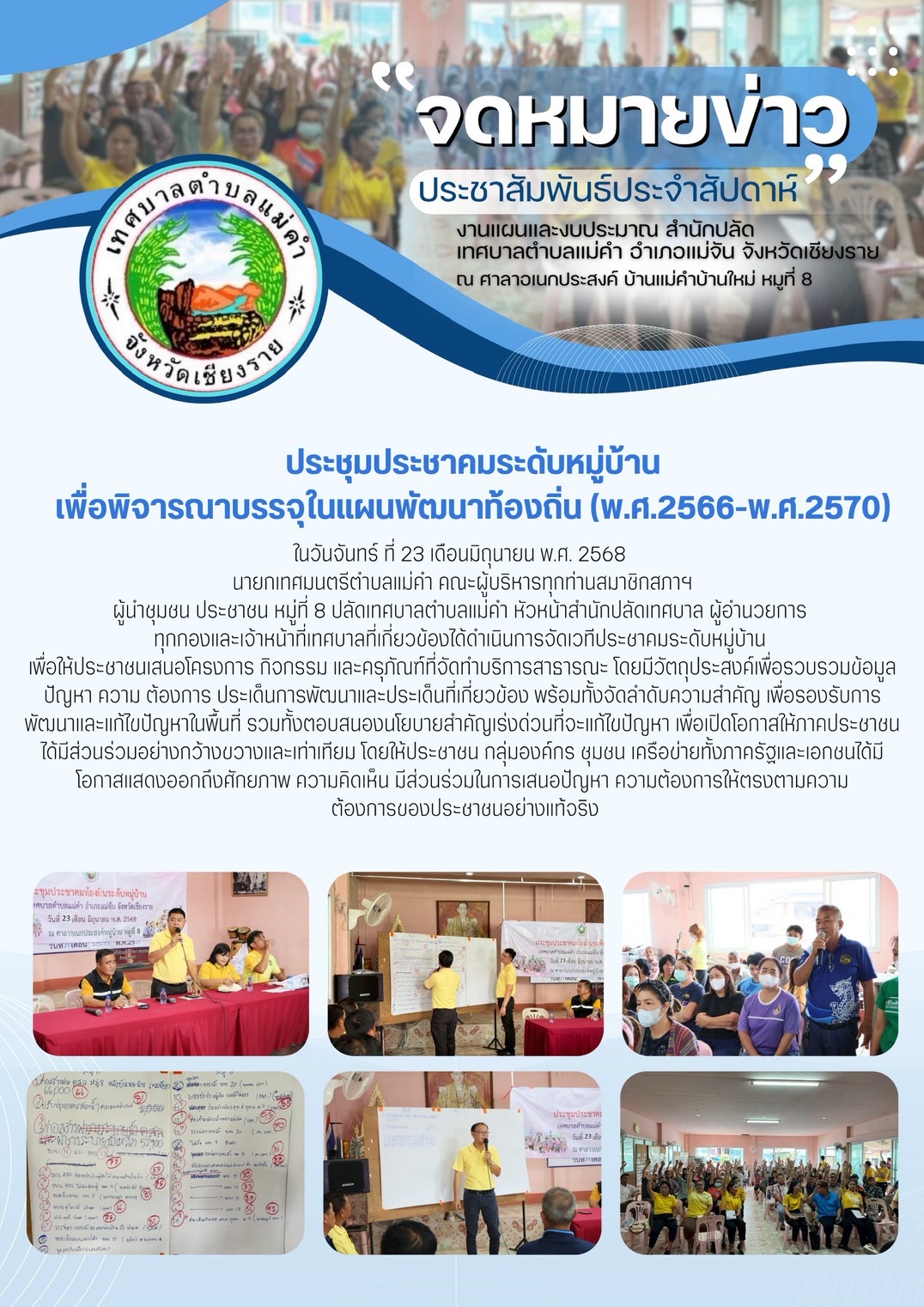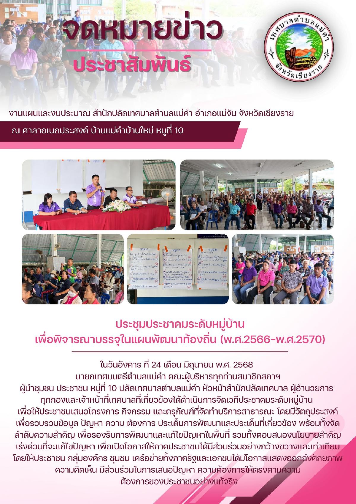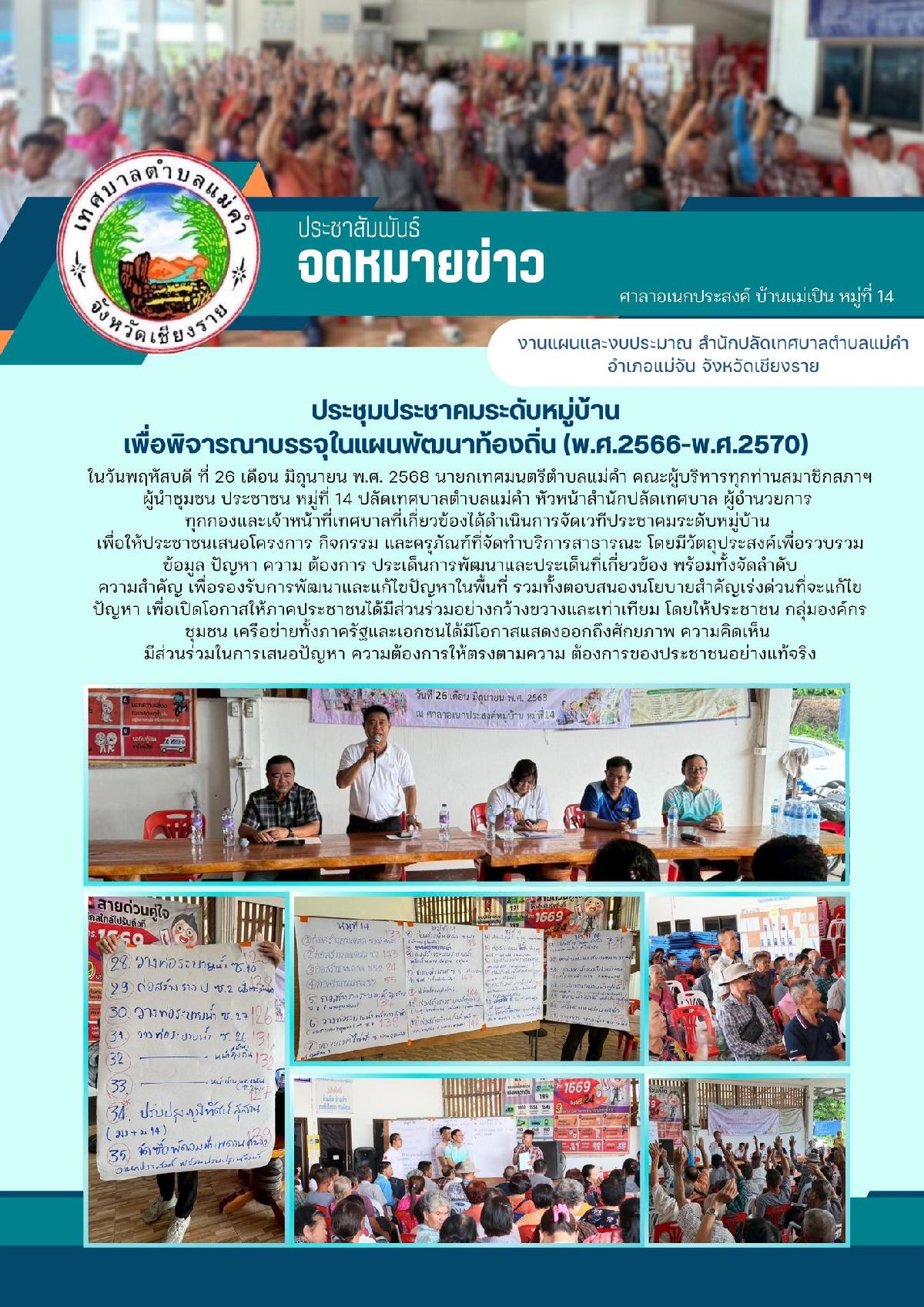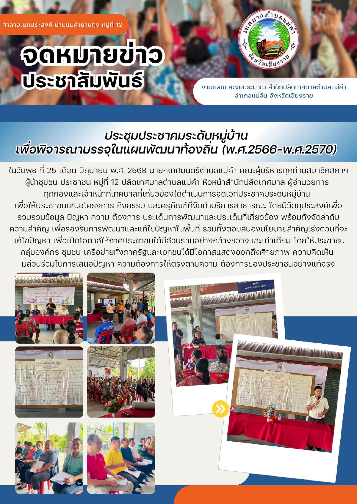 นายชัยวัน คำเงิน นายกเทศมนตรีตำบลแม่คำ และกองสาธารณสุขและสิ่งแวดล้อม ได้ร่วมเปิดโครงการป้องกันควบคุมโรคติดต่อและภัยสุขภาพในชุมชน หมู่ที่ 12 ประจำปีงบประมาณ 2569