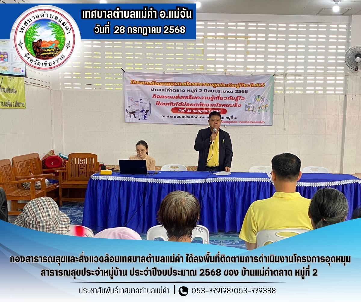 นายชัยวัน คำเงิน นายกเทศมนตรีตำบลแม่คำ และกองสาธารณสุขและสิ่งแวดล้อม ได้ร่วมเปิดโครงการป้องกันควบคุมโรคติดต่อและภัยสุขภาพในชุมชน หมู่ที่ 12 ประจำปีงบประมาณ 2569