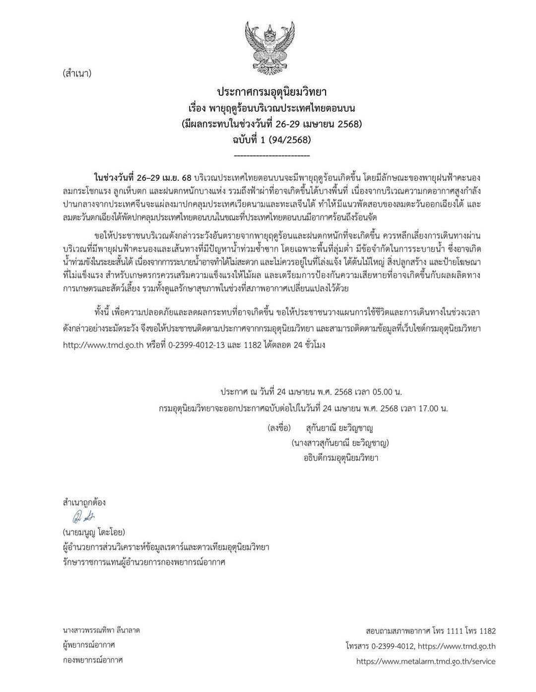 ประกาศกรมอุตุนิยมวิทยา เรื่อง พายุฤดูร้อนบริเวณประเทศไทยตอนบน(มีผลกระทบในช่วงวันที่ 26 - 29 เมษายน 2568 )ฉบับที่1(94/2668)