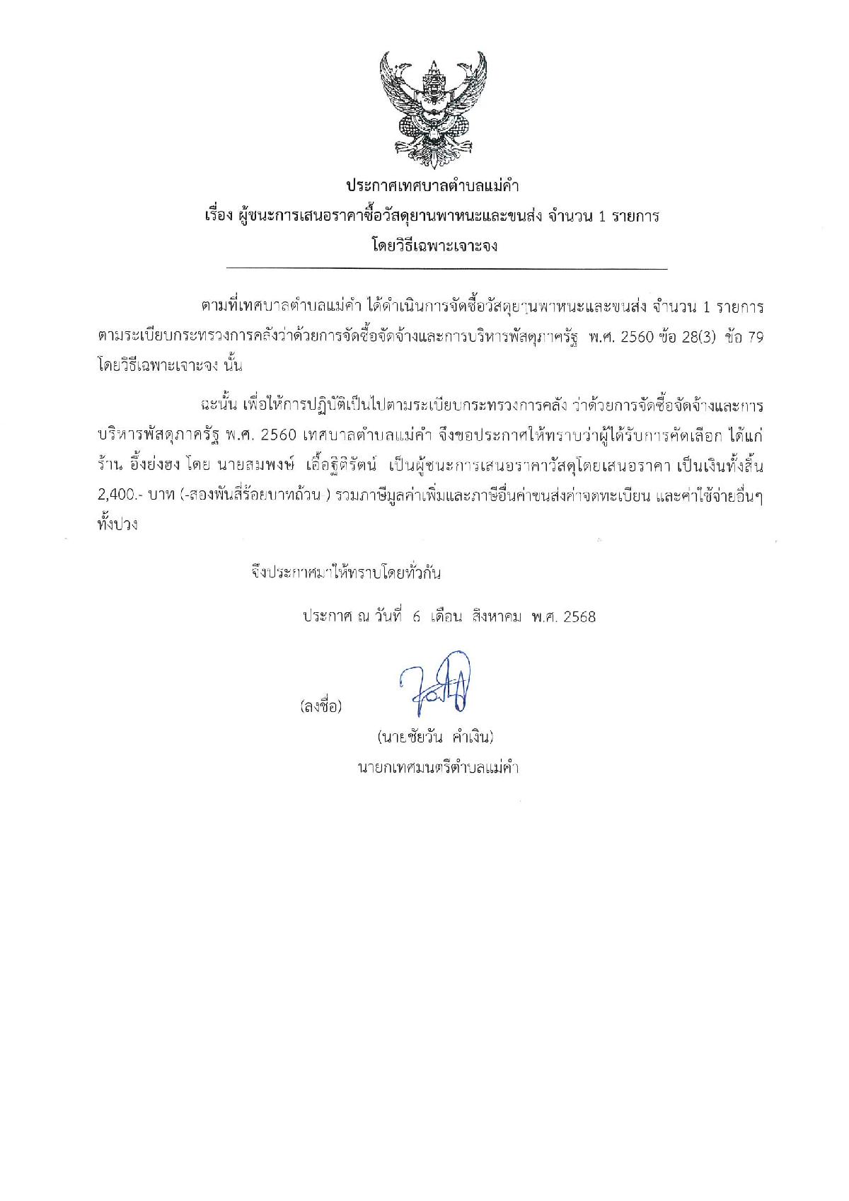 ประกาศผู้ชนะการเสนอราคา จ้างเหมารถรับส่งเด็กนักเรียนของสถานศึกษา ที่อยู่ใความดูแลของเทศบาลตำบลแม่คำ